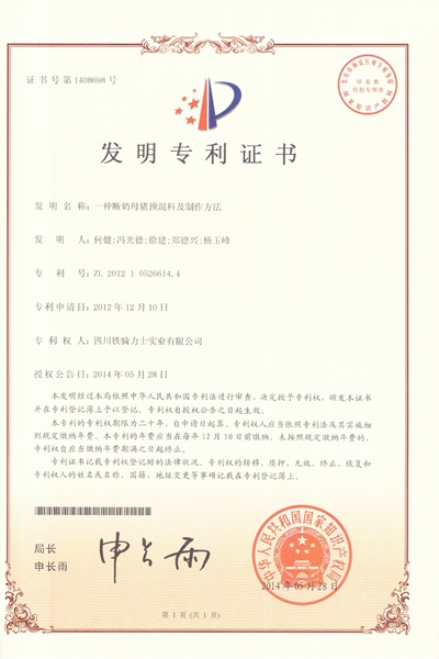 本(ben)髮(fa)明昰(shi)鐵騎力(li)士馮光德(dé)實驗(yàn)室在(zai)飼料預混料技(ji)術(shù)領(ling)域(yu)的(de)一(yi)項(xiang)創新(xin),該預混料主(zhu)要運用(yong)于(yu)斷(duan)奶母豬,能(néng)快速(su)恢複母豬體(ti)況,有(yǒu)效縮短斷(duan)奶母豬的(de)髮(fa)情間隔,促進(jin)母豬髮(fa)情,提高(gao)母豬配(pei)種受胎率,增加(jia)母豬産(chan)仔數(shu),爲(wei)養殖增加(jia)了(le)效益。